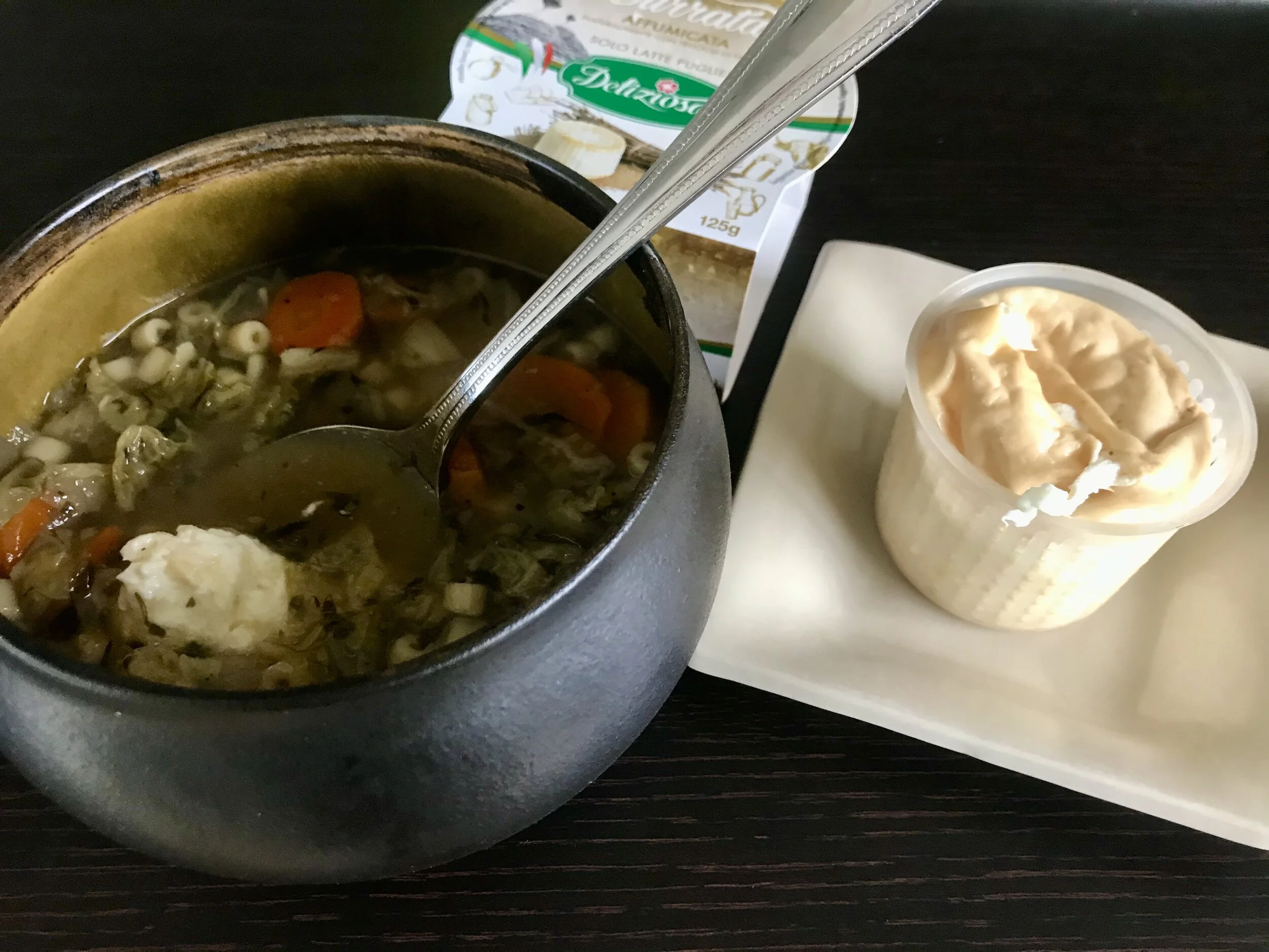 Pour se réparer en douceur des quelques excès de ces derniers jours gras, rien de tel qu’une soupe chaude et fumante. On a chacune et chacun notre recette sans effort pour ce genre d’alicament de lendemain de veille, mais pour celles et ceux qui voudraient varier, je vous propose cette version dans laquelle on garde les morceaux de légumes avec une touche savoureuse des Pouilles. Une sorte de minestrone hivernale sans tomate où je remplace le parmesan final par de la burrata fumée au goût boisé et réconfortant. On en trouve chez les épiciers italiens en tous temps et dans quelques supermarchés pendant cette période des fêtes.
